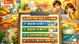 お金全般 インフレ時代の家計の守り方|支出削減+貯蓄で実践すべき5つの戦略 「最近、何もしていないのにお金が減るのが早い…」そんな感覚はありませんか?食料品、電気代、ガソリン代、日用品…。あらゆるものの価格が上がる今、私たちは“見えない値上げ”に直面しています。これが**インフレ(物価上昇)**です。インフレ時代は... 2026.03.05 お金全般